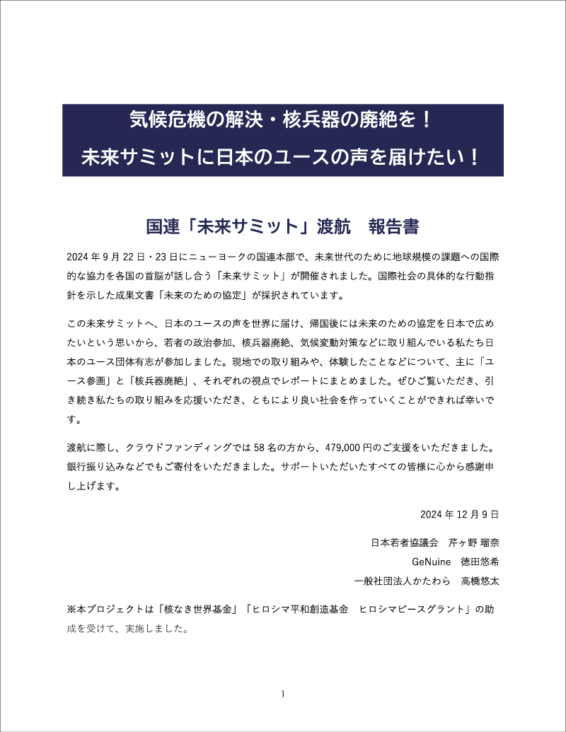 2025年度「核なき世界基金」助成事業(青年枠)で支援を行った、一般社団法人かたわら 高橋悠太様より、「核なき世界基金」助成事業 中間報告書が届きました。
