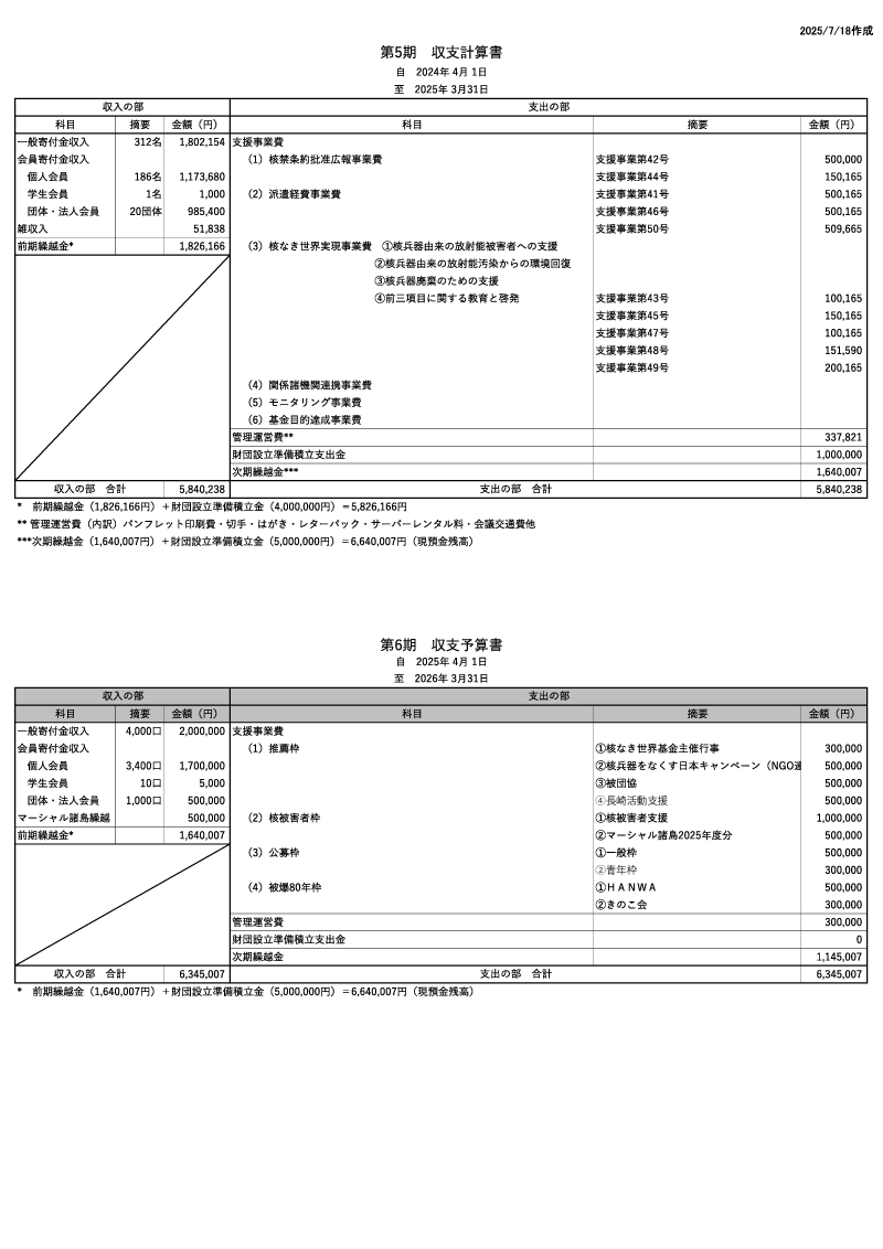 去る6月26日に開催された「核なき世界基金」の運営委員会、及びその後に行われた稟議を通して、第5期2024年度(2024年4月1日~2025年3月31日)の収支決算と、第6期2025年度(2025年4月1日~2026年3月31日)の予算が承認されました。大変遅くなりましたが、ここにご報告申し上げます。