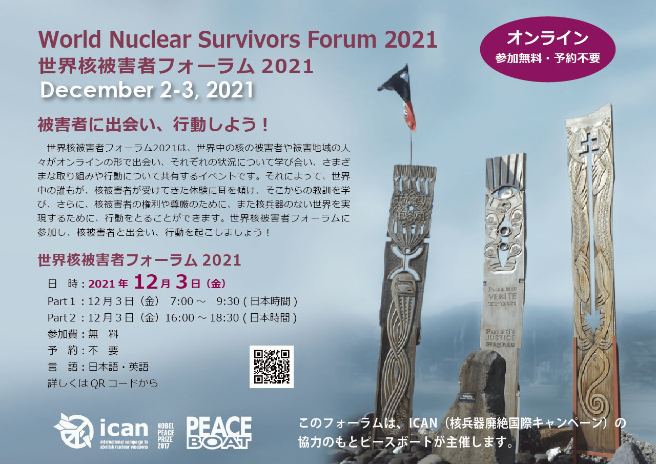 ピースボートは、ICAN(核兵器廃絶国際キャンペーン)と協力して、2021年12月2~3日(日本時間では12月3日)に「世界核被害者フォーラム2021」をオンラインで開催します。これは、世界の核兵器の被害者の声を集め、被害地域の状況を学び合い、その取り組みや行動について共有するためのオンラインの国際フォーラムです。太平洋、北米、ヨーロッパ、そして日本を含むアジアから、ウラン採掘、核実験、核兵器の生産そして使用の被害者らが集まります。