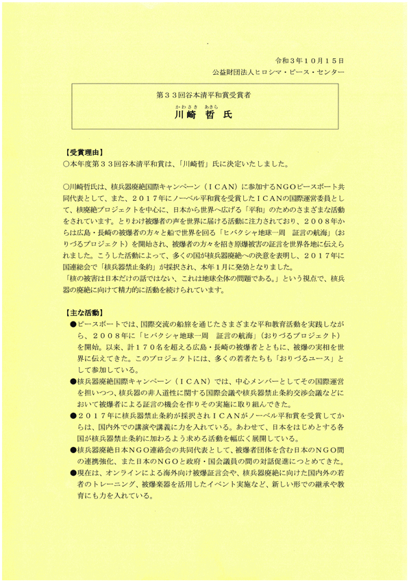 なお、「核なき世界基金」の目的の一つである「『核兵器禁止条約』の批准・発効を後押しする活動の支援」という項目は、今後、被爆国日本をはじめ、同条約の批准国・地域がさらに増加することを目指す支援へと、その基準を更新して、皆様とともに前進していきたいと思います。このことを反映した新しいパンフレットの印刷も検討しています。