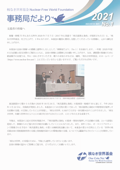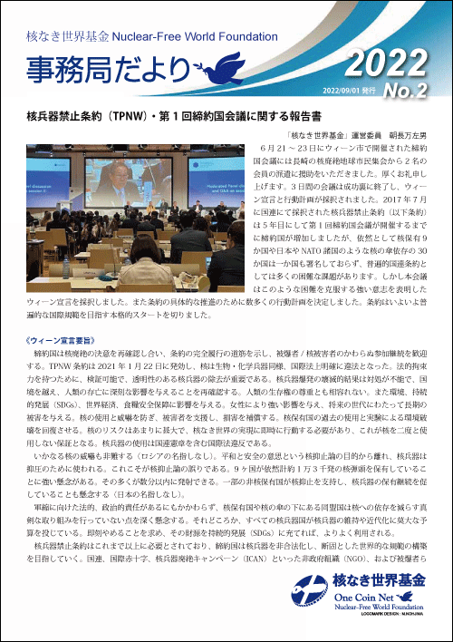 「核なき世界基金」の活動報告や基金の経過報告などは、経費の削減のために、おもに基金のホームページにておこなっていますが、年に一度、紙面にて1年間の報告とお知らせするために、「事務局だより」を発行しています。